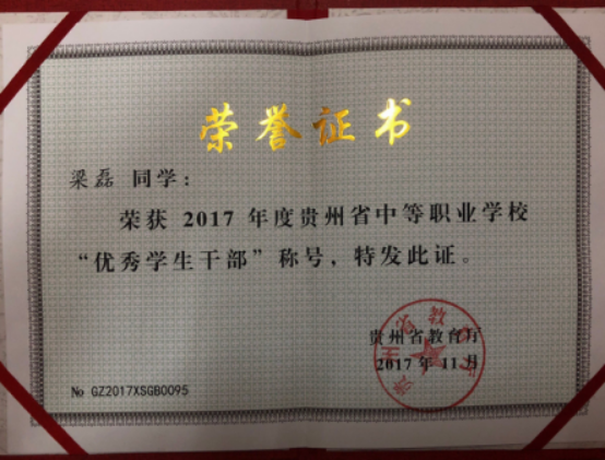 年度梁磊同学获得省级中职优秀学生干部荣誉称号