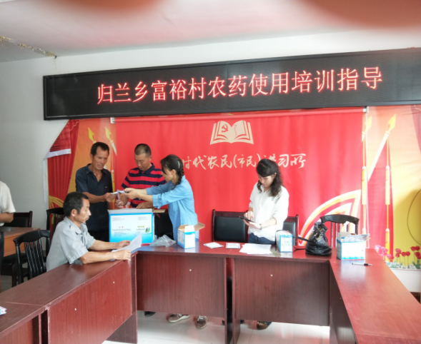 2018年5月30日,来自黔南职院的科技特派员罗来银、杨吉惠两位专家再次来到归兰水族乡富裕村,对部分村民就水稻病虫害防治中农药的正确使用进行培训与指导,并向农民免费发放水稻高效低毒低残留农药。