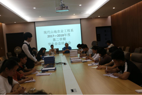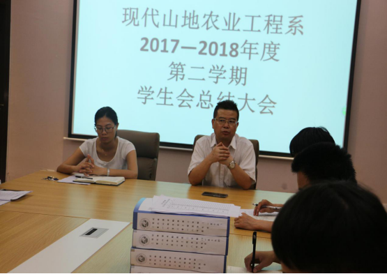 2018年7月4日,现代山地农业工程系学生会在知行楼6楼会议室召开学期总结大会。现代山地农业工程系范大有主任、系党总支朱永毅书记、系学管宋志雪主任、系学生会指导老师马光强等出席。