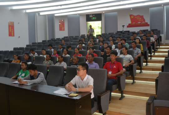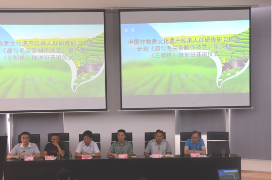 根据贵州省传统手工技艺助推脱贫培训计划(2016-2020年),结合文化部办公厅、教育部办公厅《关于实施中国非物质文化遗产传承人群研修研习培训计划的通知》(办非遗函〔2015〕581号)和贵州省非物质文化遗产保护传承教育培训基地遴选工作实施方案的要求,在贵州省文化厅的领导、关心、支持下,在黔南州文化广电新闻出版局指导下,中国非物质文化遗产传承人群研修研习培训计划“都匀毛尖茶制作技艺培训班”(第六期),今天在我院知行楼圆形报告厅开班。上午9点正式举行了开班典礼,出席开班典礼的领导有:黔南州文化广电新闻出版局非遗科黄家富科长、黔南州非物质文化遗产保护中心陈仙祥主任、黔南民族职业技术学院院长饶辉院长、黔南民族职业技术学院生管理系张金华主任,现代山地农业工程系范大有主任、三都县茶办蒙建帮主任。