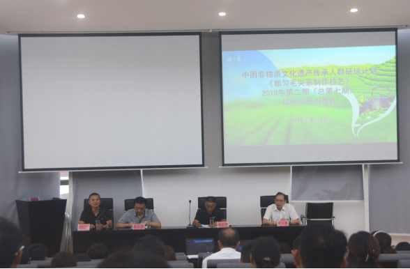 根据贵州省传统手工技艺助推脱贫培训计划(2016-2020年),结合文化部办公厅、教育部办公厅《关于实施中国非物质文化遗产传承人群研修研习培训计划的通知》(办非遗函〔2015〕581号)和贵州省非物质文化遗产保护传承教育培训基地遴选工作实施方案的要求,在贵州省化厅的领导、关心、支持下,在黔南州文化广电新闻出版局指导下,中国非物质文化遗产传承人群研修研习培训计划“都匀毛尖茶制作技艺培训班”(第七期),今天在黔南民族职业技术学院知行楼圆形学术报告厅如期开班。