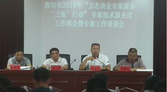 为深入贯彻落实习近平新时代扶贫思想和省委十二届三次全会精神,推动农业专家精准对接产业、服务脱贫攻坚,2018年8月22日,我系朱永毅等8名科技特派员在都匀市离退局参加都匀市“万名农业专家服务‘三农’行动”专家技术服务团工作例会暨专家工作培训会。会议对全市农业专家精准服务脱贫攻坚工作进行了安排部署。市联络协调办成员单位相关领导、都匀市专家技术服务团专家(科技副职、科技特派员、扶贫产业相关的农业专家)、各乡(镇、办事处)分管领导共60余人参加会议。市政府党组成员、副市长郭永昌出席会议并讲话。