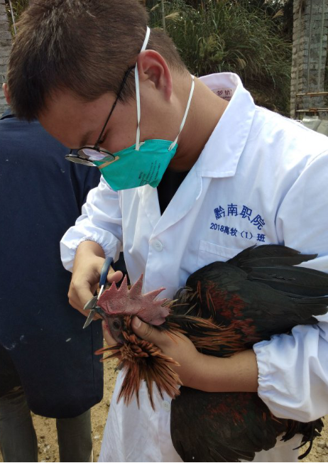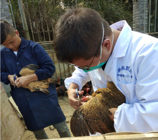 副会长罗磊磊在出发之前强调外出注意安全,服从安排。到了养殖场门口同学们先严格进行消毒再进入养殖场,后开始进行明确的分工,两个小时的时间完成了对鸡的疫苗注射与剪喙的工作,同学们都积极动手实践,体现不怕累、不怕苦、不怕脏的精神。