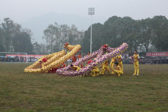 黔南民族职业技术学院舞龙队向全院师生展示民族瑰宝,二龙戏珠预示着黔南职院的崛起。