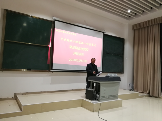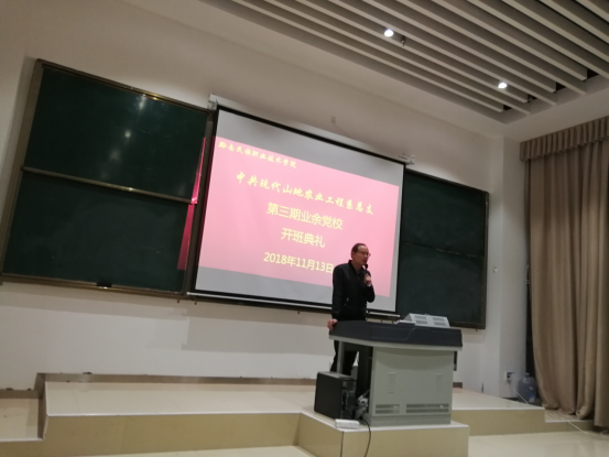 为了加强同学们的政治思想,推进党建工作,让同学们在思想上和行动上向党组织靠拢。2018年10月13日晚上,现代山地农业工程系在知行楼1-1教室举行了业余党校开班典礼。本次开班典礼由学生党支部书记夏传金老师主持,出席本次开班典礼的还有系党总支书记朱永毅老师、系主任范大有老师、系党总支成员杨均、宋志雪老师、教师党支部书记庭玉凤老师、系团总支成员和18级所有团员等。