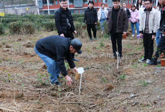 当我们来到茶山,系教室党支部的宋光智老师和陈鹏老师早已在茶园等候,宋光智老师积极下地指导同学们种植茶苗,特别需要注意的是茶苗的行距和窝距,这样才利于茶苗的生长。