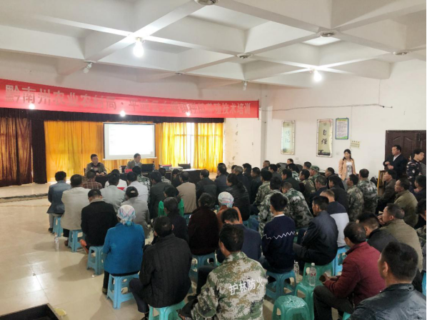 4月12日,黔南州农业农村局扶贫专班在平塘县农工局的协助支持下,邀请贵州大学肖超能教授、黔南职院庭玉凤老师到大塘镇新营村开展为期一天的长毛兔养殖和金丝皇菊种植技术培训,培训会采取室内培训与现场指导相结合的方式进行,大塘镇12个村共120名村民(含贫困户)参加培训。