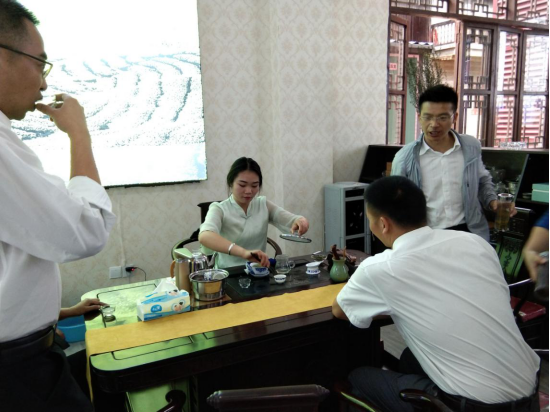 随后我院获得省茶艺大赛银奖的陈悦沁老师和我院匀茶坊的学生罗帮雪,在生态茶馆现场进行的茶艺表演,获得观摩领导的好评。