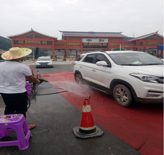 (图为在值班卡点值班,对下高速车辆进行消毒检查)