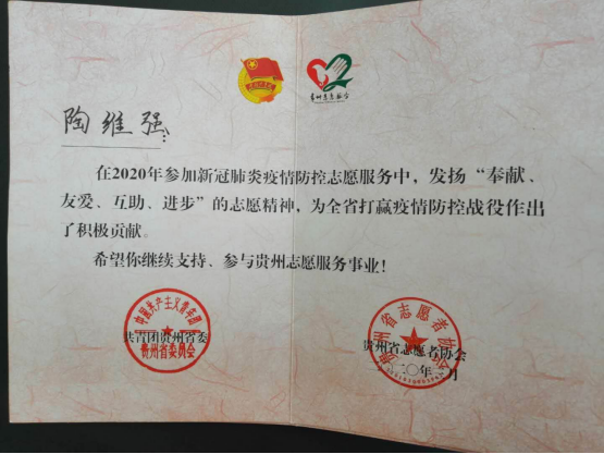 现代山地农业工程系2017级畜牧兽医二班陶维强同学在2020年新型冠状病毒肺炎疫情防控志愿者工作中,发扬“奉献、友爱、互助、进步”的志愿精神,为全省打赢疫情防控战役做出了积极贡献,得到贵州团省委和志愿者协会的表彰。