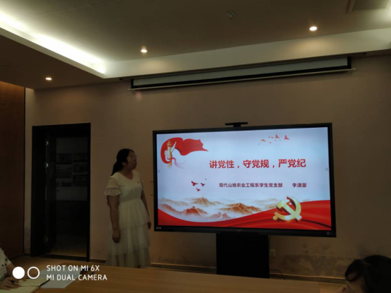 随后,学生支部书记李潇蒙同志做“讲党性,守党规,严党纪”专题党课学习,主要讲解《党章》、《中国共产党廉洁自律准则》和《中国共产党问责条例》,学习党章关于党的性质、宗旨、指导思想、奋斗纲领和重大方针政策,党员权利和义务,党的制度和各级党组织的行为规范等内容。通过党课学习,全体党员表示增强了党性修养、提高了纪律意识,提升了政治境界、思想境界、道德境界,今后会更加自觉践行党的初心和使命。