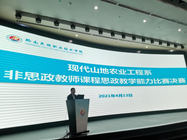 为落实学院“3375”育人工程和“门门课程讲德育,个个教师讲育人”的课程思政目标,深入挖掘非思政课程中的思想政治教育元素,将培育和践行社会主义核心价值观、职业道德、行为操守、工匠精神等隐性内容与非思政课程显性内容相结合,做到教书与育人相统一,帮助学生坚定正确的理想信念、价值理念和道德观念,形成高尚的科学文化素养和乐观向上的生活态度,实现课程思政与思政课程的同向同行,全面推进我系思想政治教育工作,同时遴选2名教师参加学院课程思政教学能力比赛,现代山地农业工程系于2021年4月13日14:30在知行楼学术报告厅举行非思政教师课程思政教学能力比赛决赛。