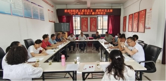 在凌湾村村委会,进行了“1+2”校村(社)融合座谈会,参与座谈会的有凌湾村党支部书记、村委会主任张正武、副书记莫定武、组织委员孟宗举、宣传委员苏艳、驻村第一书记王有进、村委会副主任刘锐仙、村“两委一队”成员罗兵、孟忠恒、农工系党总支书记朱永毅、专职副书记宋志雪、潘明兴教授、夏传金副教授、罗来银副教授、杨庆副教授、蒙明洲、彭莹、何华婷和王璐璐等老师。会上凌湾村党支部张正武书记首先介绍了凌湾村基层组织建设、经济社会发展情况、重点工作、存在的困难和问题以及下一步工作打算,他希望通过“1+2”机制,发挥党建引领作用,充分利用黔南职院农工系党总支专业人才优势和基层党建经验,结合凌湾村资源优势,促进凌湾村基层组织建设和产业发展。