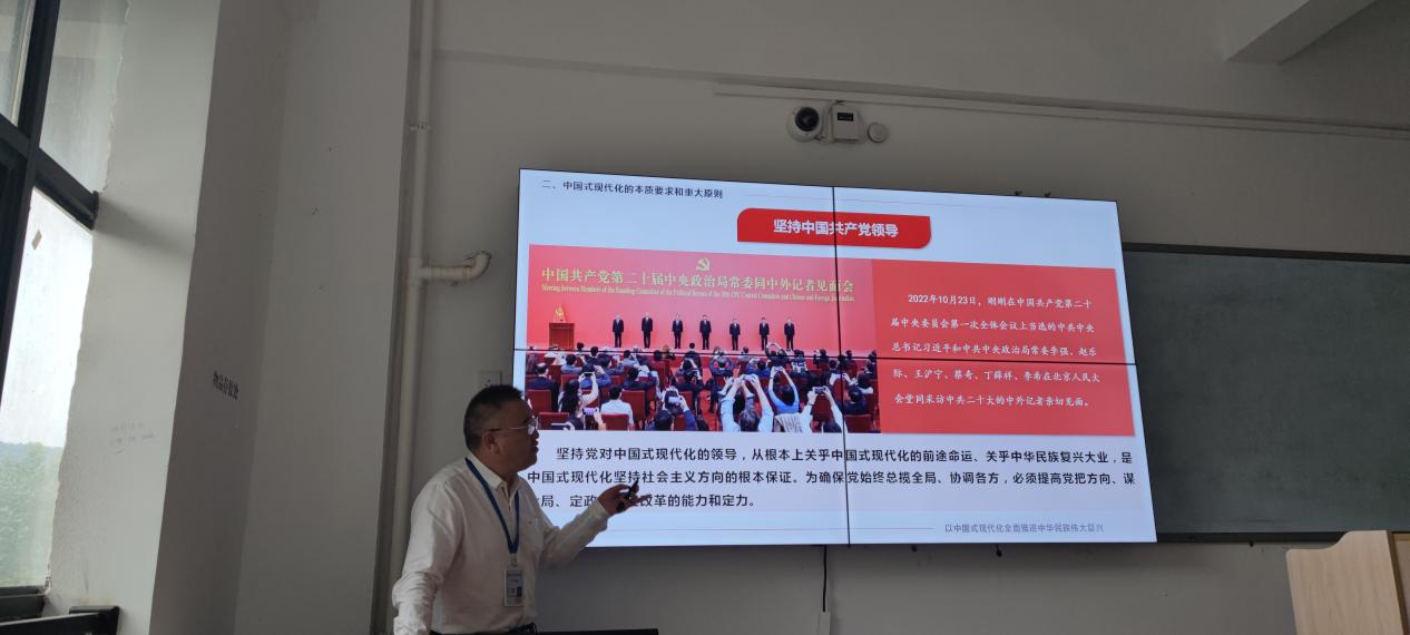 刘荣鹏同志向师生解读了中国式现代化的的九个本质要求:坚持中国共产党领导,坚持中国特色社会主义,实现高质量发展,发展全过程人民民主,丰富人民精神世界,实现全体人民共同富裕,促进人与自然和谐共生,推动构建人类命运共同体,创造人类文明新形态。