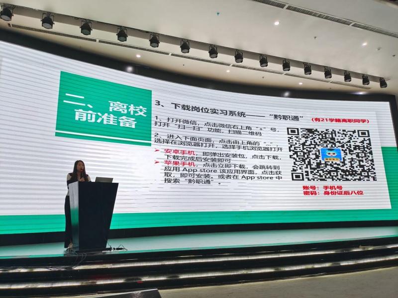 首先,教学科研科罗致茜老师讲解了岗位实习规定,向2021级实习生提出了明确的实习全过程要求:一是离校前资料上交要齐全,二是实习中贵州省实习管理系统“黔职通”的使用要规范,三是实习后的考核资料上交要及时。