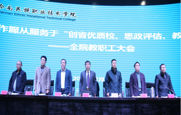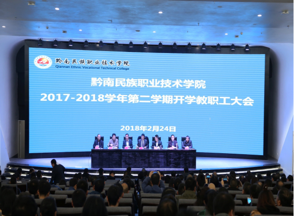 一元复始,万象更新。为指明新学期学院创省级优质高职院校、思政评估创优、教学诊改创优“三创三优”工作方向,确保各项工作的有序开展,2月24日,我院2017——2018学年度第二学期开学教职工大会在知行楼讲学厅召开。党委书记罗俊,院长饶辉,副书记胡成林、韦永革,副院长金焱、张正荣,党委委员张泽宽出席会议。全体教职员工参加会议。会议由副院长金焱主持。