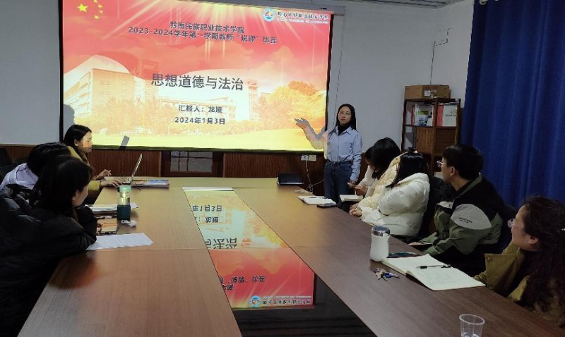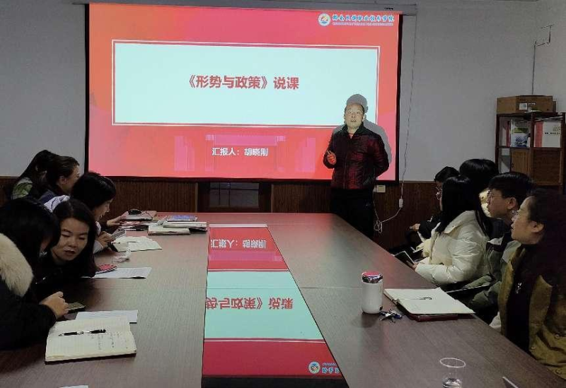 为组织做好学院关于开展首届“金专、金课、金师”“三金”大赛活动,促进部门全体思政教师研读人培方案、钻研教材、探索教法,进一步提升思政课课堂教学质量,营造良好的教育教学改革研究氛围,2024年1月3日,马克思主义教学部组织开展思政课教师说课展示活动。
