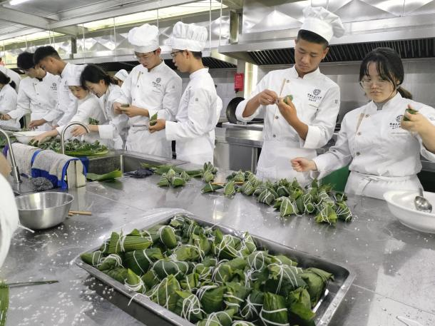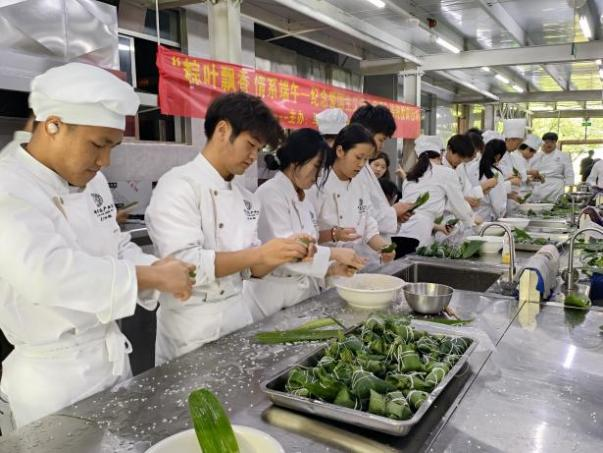 随后,在烹饪专业教师的示范教学下,在场师生认真地学习如何卷粽叶、放米、捆扎等环节,自己动手包粽子。活动中不时传出欢声笑语,气氛十分热烈。经过近3小时的努力,100斤大米变成了一个个菱形、三角形、喇叭形、牛角形、长条形不同样式但凝聚同学们辛勤劳动的粽子。大家看到自己的劳动果实,脸上露出喜悦的笑容。