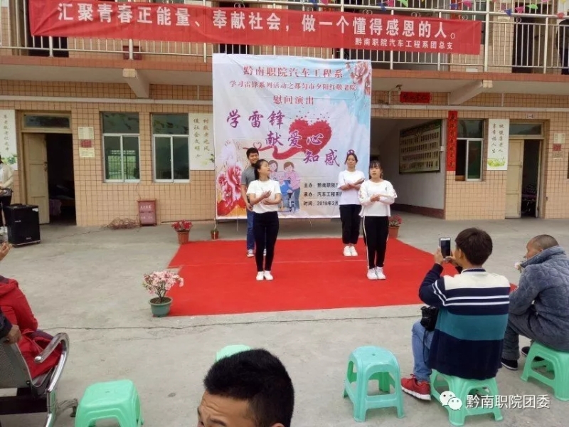 阳春三月,春意盎然。为践行雷锋精神,弘扬尊老、爱老、敬老、助老的中华民族传统美德,积极倡导“奉献、友爱、互助、进步”的志愿精神,引导同学们树立尊老、敬老的意识。3月22日上午,汽车工程系团总支组织学生30余名团干前往都匀夕阳红敬老院开展慰问演出活动。