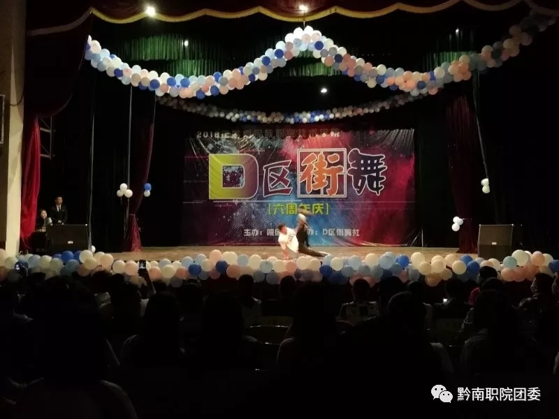 2018年5月31日晚黔南职院D区街舞社为庆祝社团成立六周年,特在南区讲学厅举行了六周年生日晚会,此次晚会街舞社团还邀请了黔南民族师范学院街舞社、黔南民族医学高等专科学院街舞社、都匀市复特街舞培训机构、都匀桥城街舞培训机构及恋舞工作室。