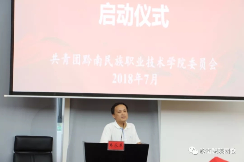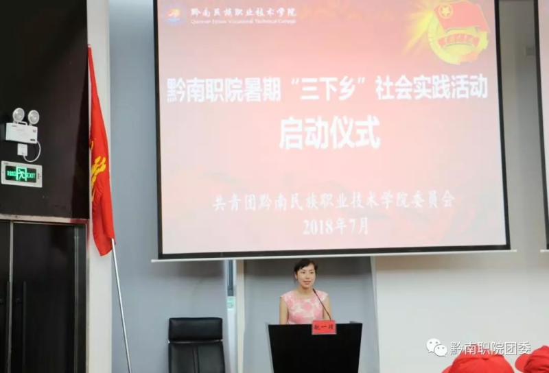 2018年7月13日,黔南民族职业技术学院2018暑期“三下乡”出征仪式在圆形报告厅隆重举行,由院团委副书记赵一瑾老师主持。院党委韦永革副书记出席仪式并发表重要讲话。学生处处长、院团委书记潘奇老师、现代山地农业工程系团总支书记马光强老师、汽车工程系孔佐君、郑彦博老师及本次“三下乡”志愿者参加仪式。