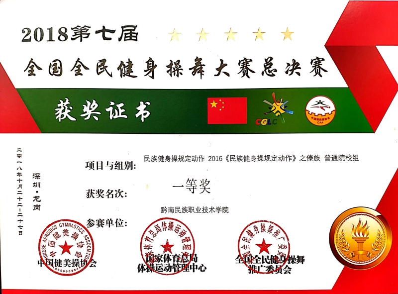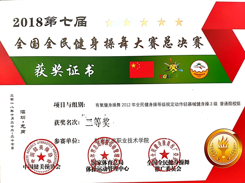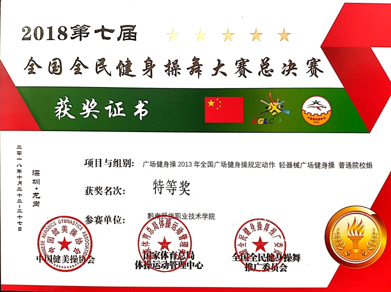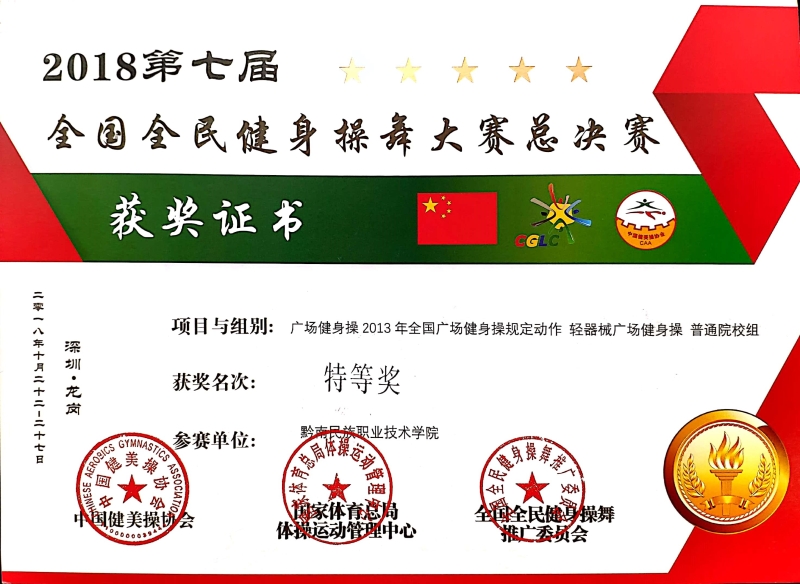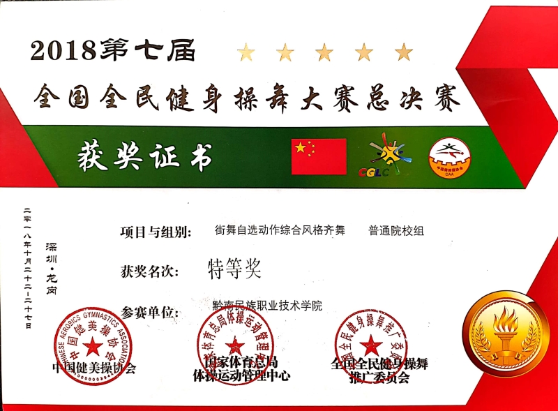 我院代表队在比赛中,精神饱满,新颖别致的造型展现了力与美的结合,严整而灵动的队列诠释了青春的激扬与奔放,最终力压群雄。分别斩获普通院校组(含本科、高职)全国广场健身操规定动作、轻器械广场健身操两个特等奖(均为第一名)、街舞(自选动作)综合风格齐舞特等奖(第三名共三名)、民族健身操 一等奖、有氧健身操二等奖。