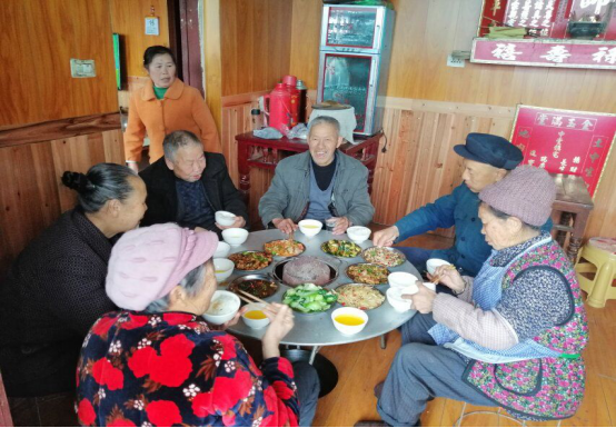 老人们吃上丰盛的午餐露出了幸福的笑容