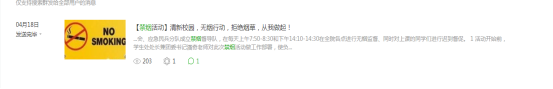 为进一步营造绿色优美、文明向上、清洁无烟的校园环境,我院学生处、团委于2019年4月17日联名发起了“清新校园,无烟行动,拒绝烟草,从我做起!”主题活动,倡导全院师生一起行动起来,让教室、宿舍、操场、卫生间等公共场合不再乌烟瘴气,让烟蒂、烟盒在校园销声匿迹。为打造4A级景区校园做全面准备!