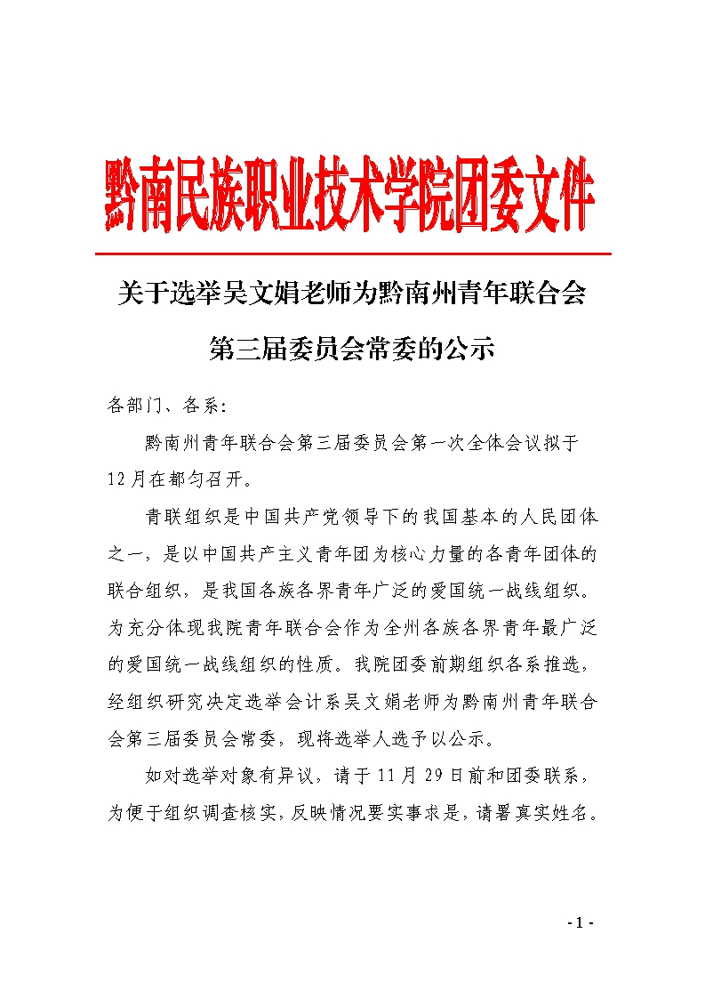 关于选举吴文娟老师为黔南州青年联合会第三届委员会常委的公示