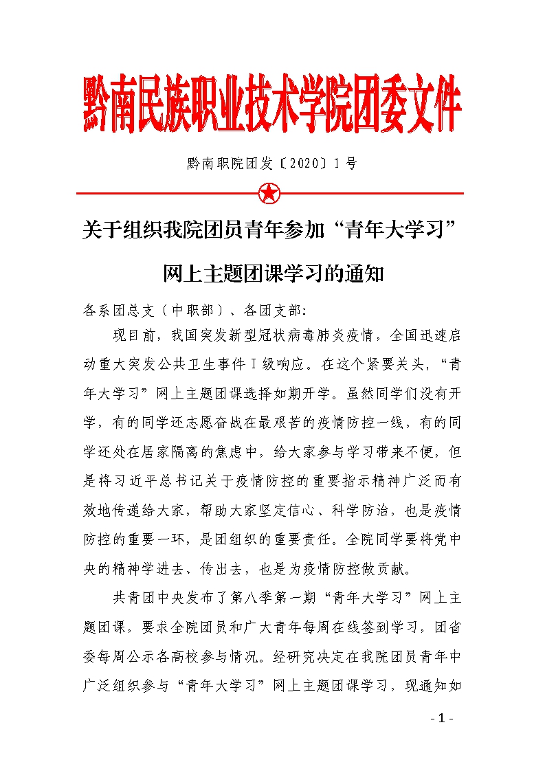 团发〔2020〕1号文件:关于组织我院团员青年参加“青年大学习”网上主题团课学习的通知