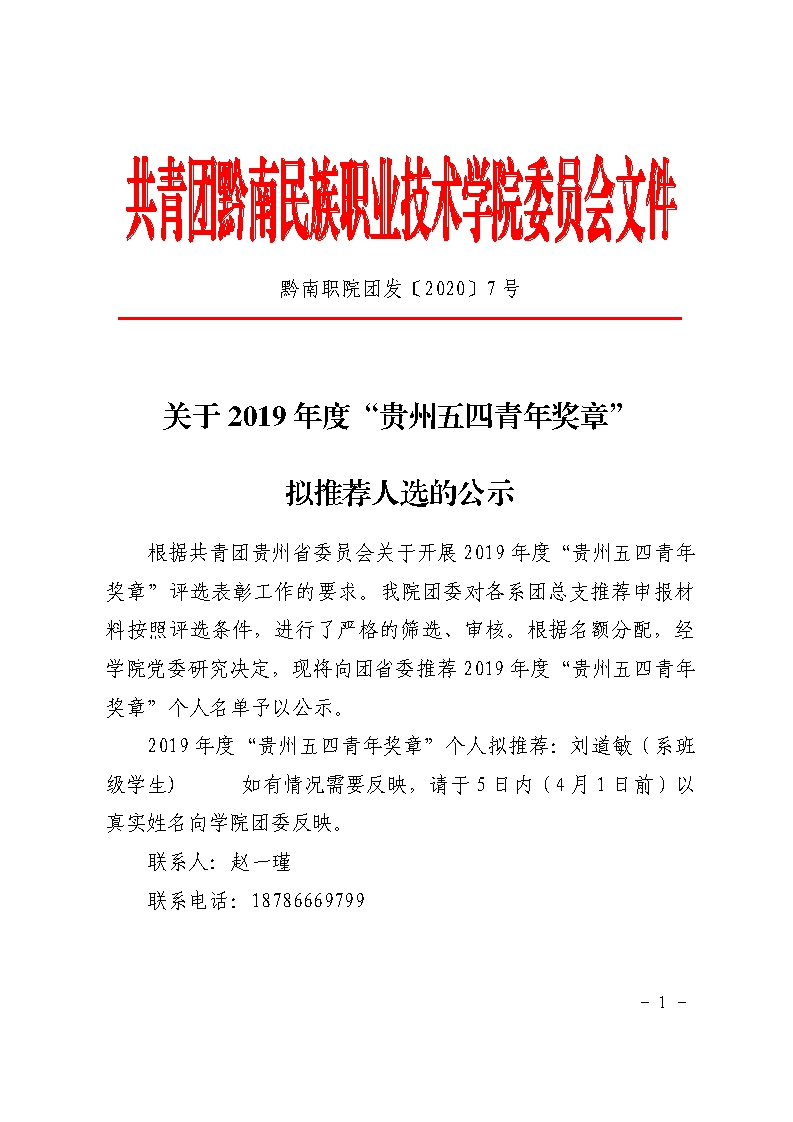 团发〔2020〕7号文件:关于拟推报“2019年度贵州青年五四奖章个人的公示