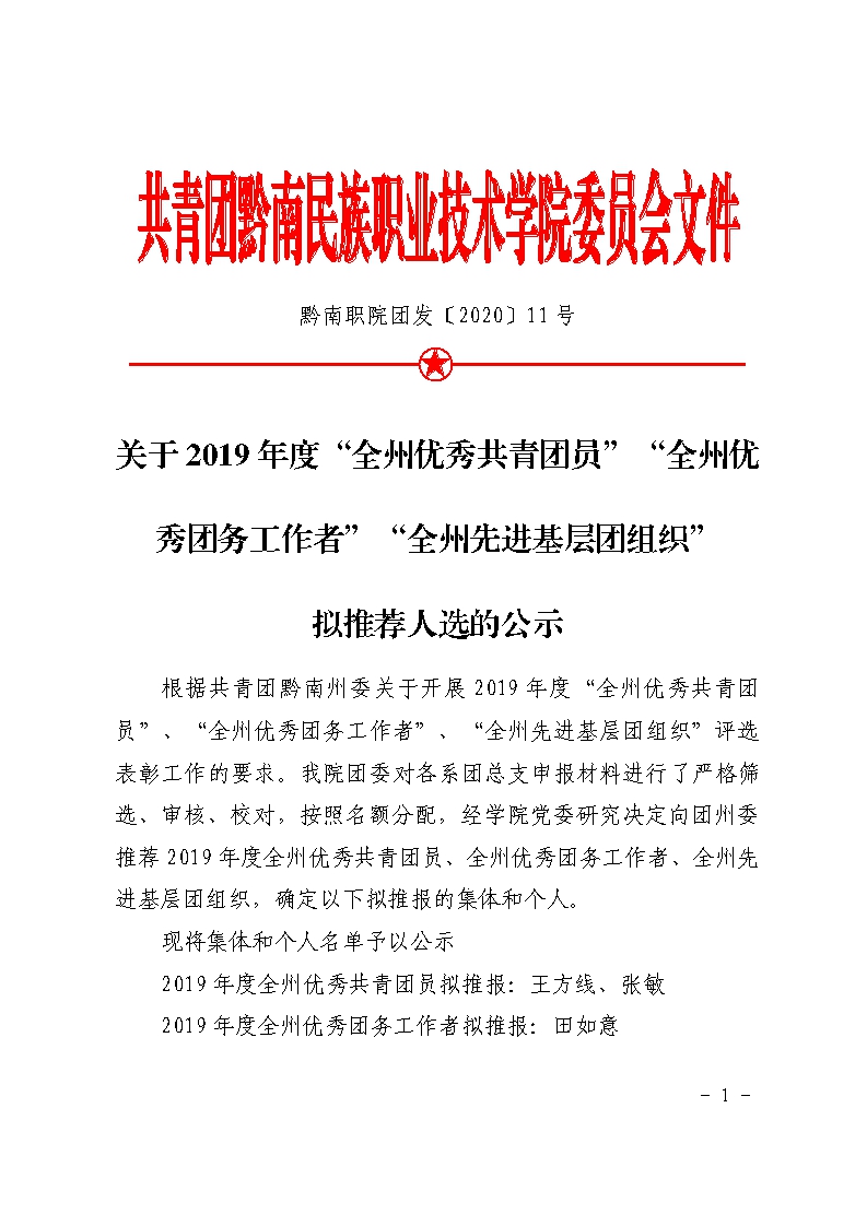 团发〔2020〕11号文件:关于2019年度“全州优秀共青团员”“全州优秀团务工作者”“全州先进基层团组织”拟推荐人选的公示