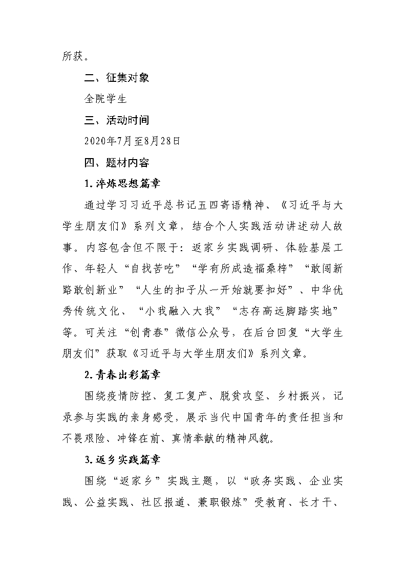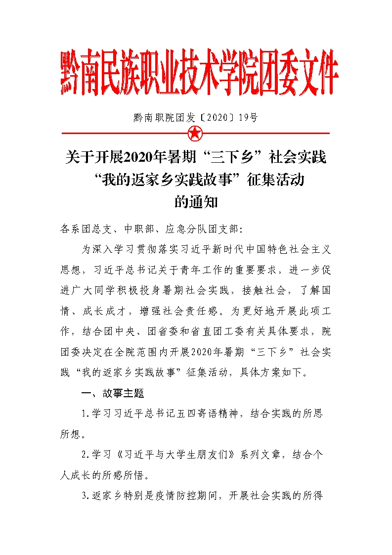 团发〔2020〕19号文件:关于开展2020年暑期“三下乡”社会实践“我的返家乡实践故事”征集活动的通知