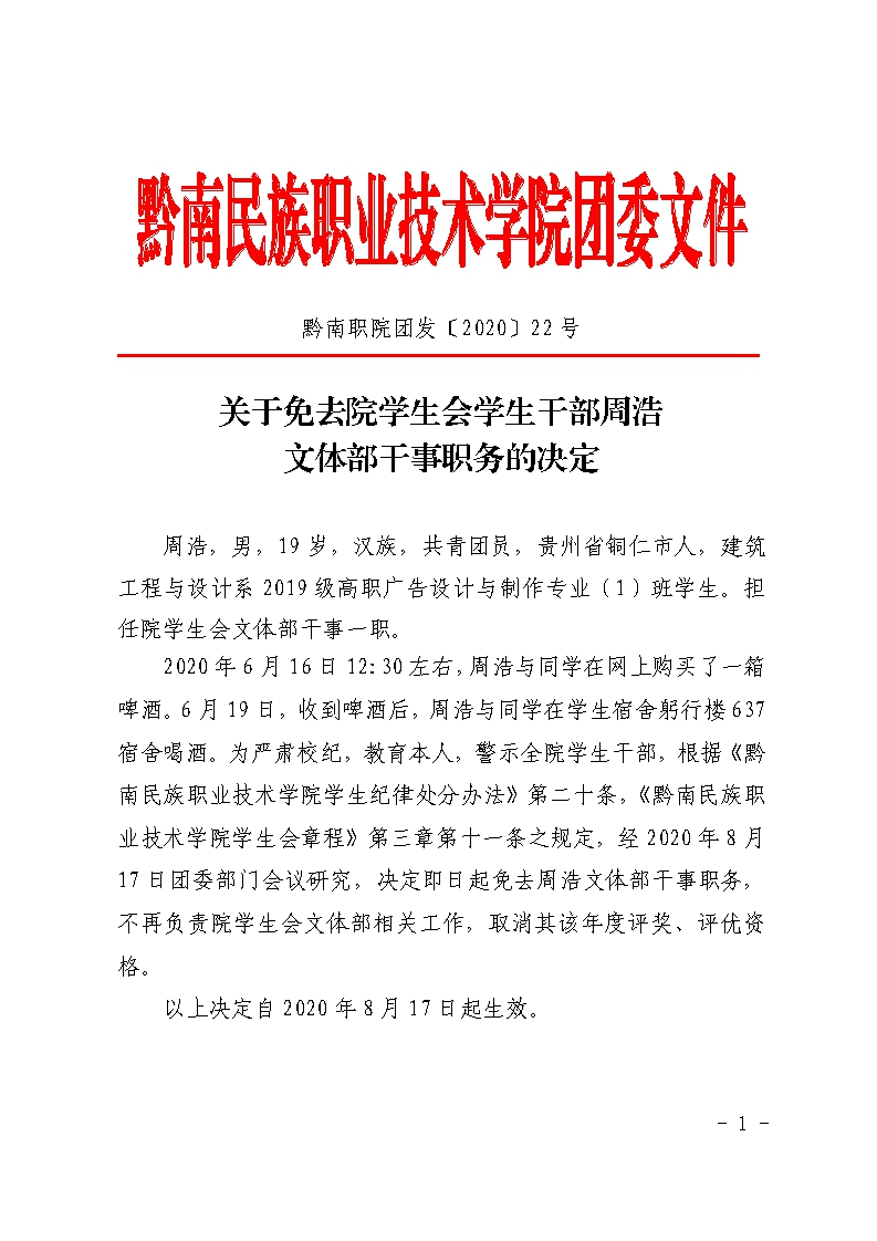 团发〔2020〕22号文件:关于免去周浩学生干部职务的决定
