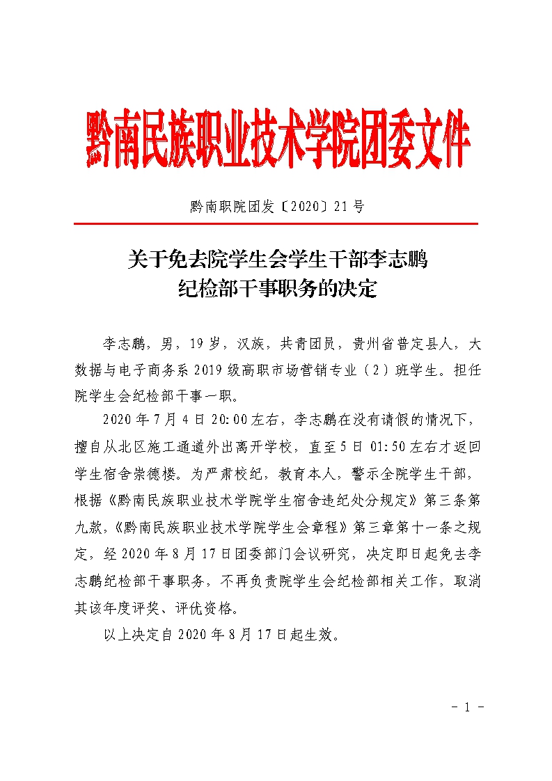 团发〔2020〕21号文件:关于免去李志鹏学生干部职务的决定