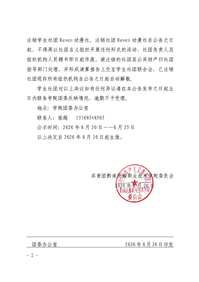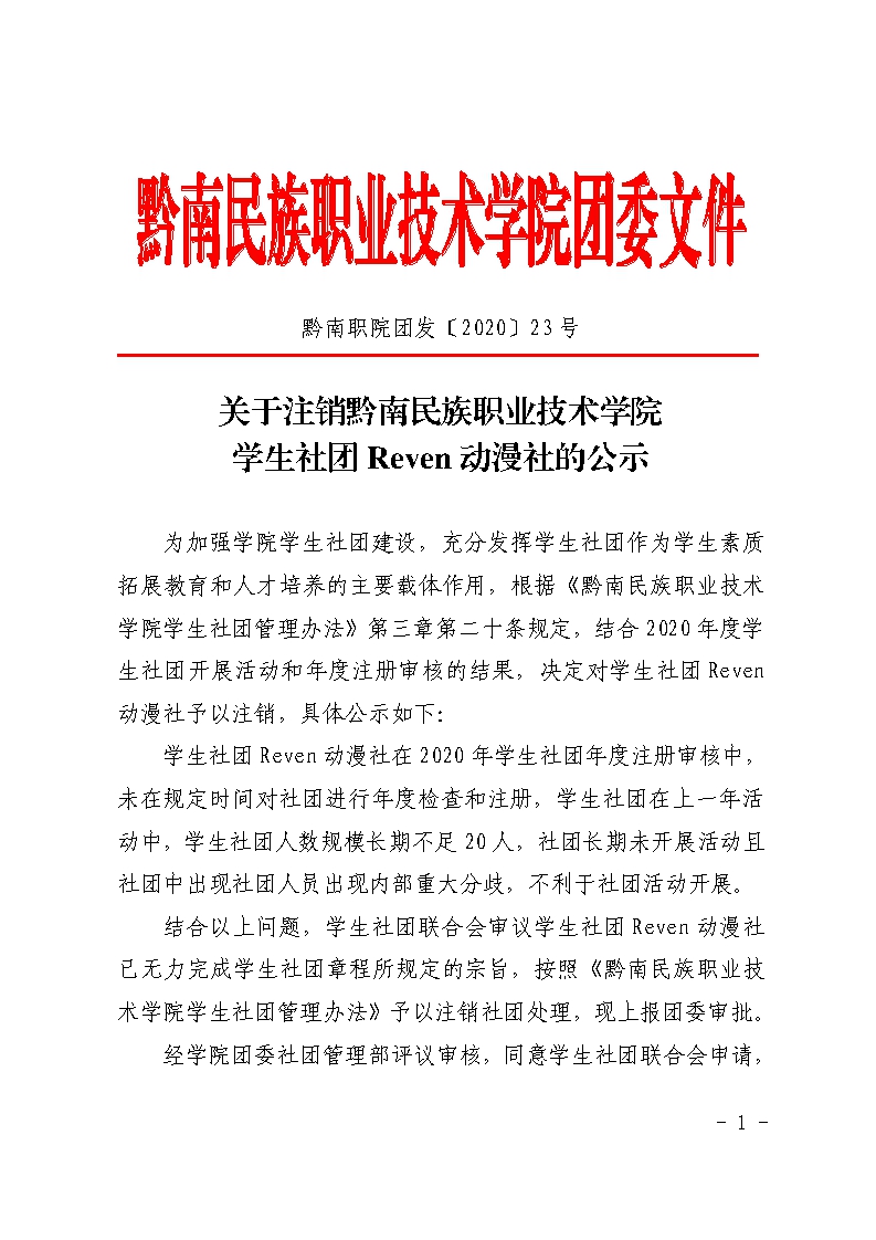 团发〔2020〕23号文件:黔南职院团发2020(23号)关于免去学生社团动漫社的公示