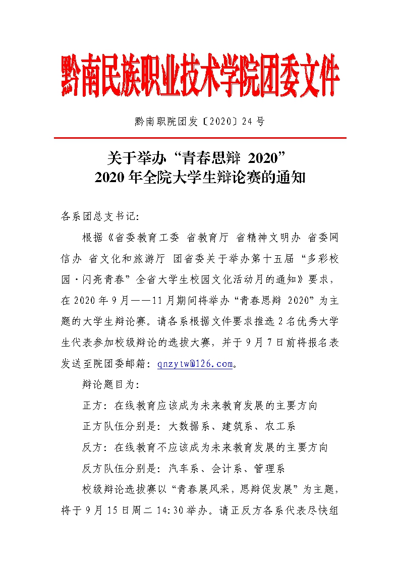 团发〔2020〕24号文件:关于举办“青春思辩 2020”2020年全院大学生辩论赛的通知