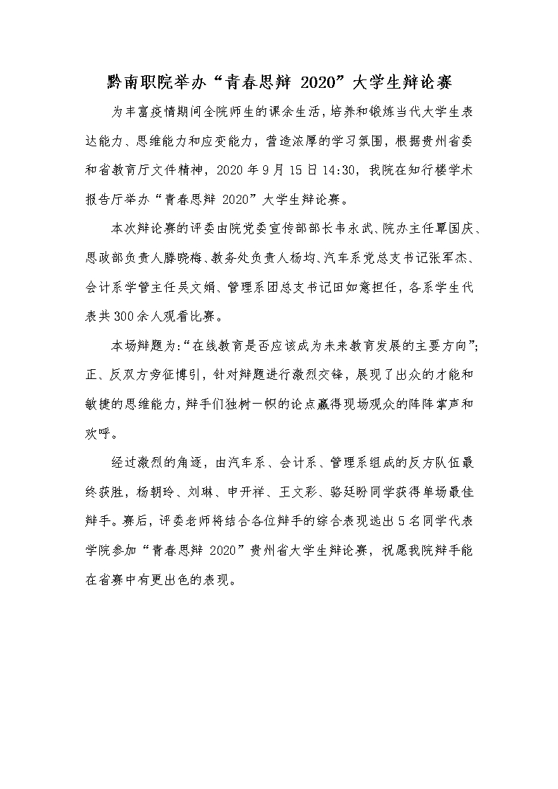 黔南职院举办“青春思辩 2020”大学生辩论赛