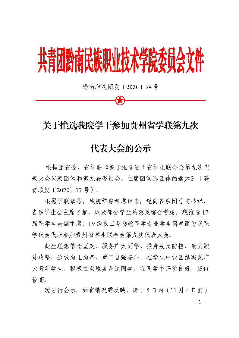 团发〔2020〕34号文件:关于推选我院学干参加贵州省学联第九次学代会的公示