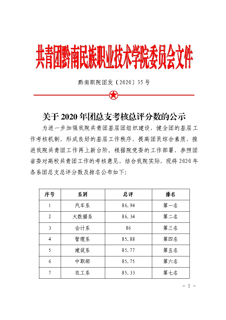 团发〔2020〕35号文件:关于2020年度6-10月各系团总支考核总评分数的公示