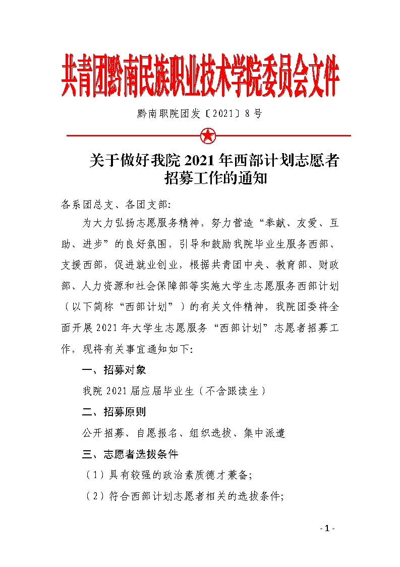 团发〔2021〕8号文件: 关于做好我院2021年西部计划志愿者招募工作的通知