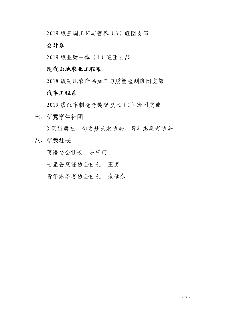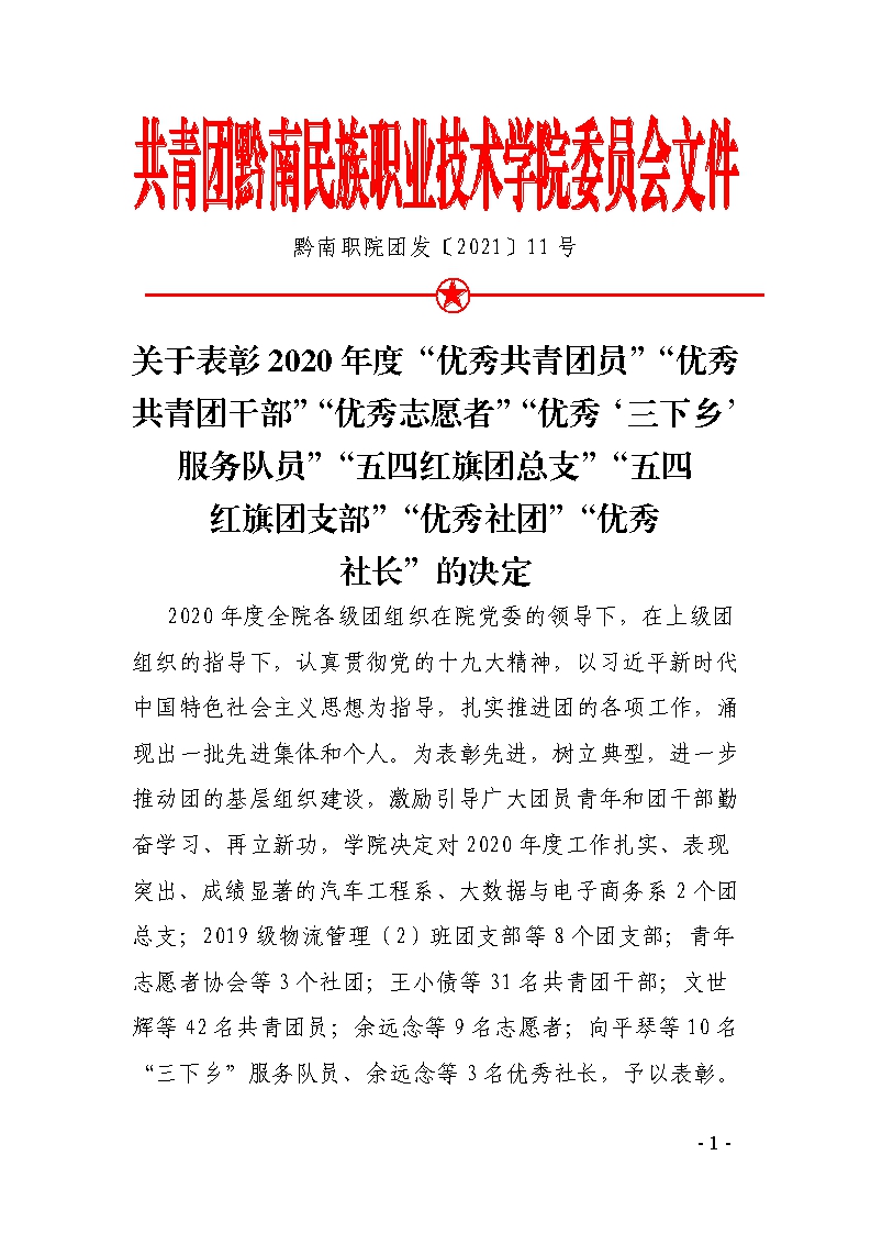 团发〔2021〕11号文件:关于表彰2020年度“优秀共青团员”“优秀共青团干部”“优秀志愿者”“优秀‘三下乡’服务队员”“五四红旗团总支”“五四红旗团支部”“优秀社团”“优秀社长”的决定