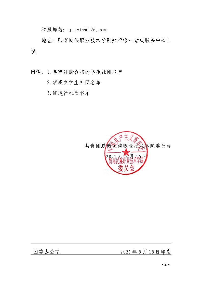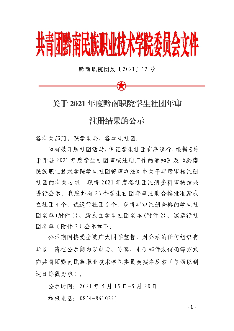 团发〔2021〕12号文件:关于2021年度黔南职院学生社团年审注册结果的公示