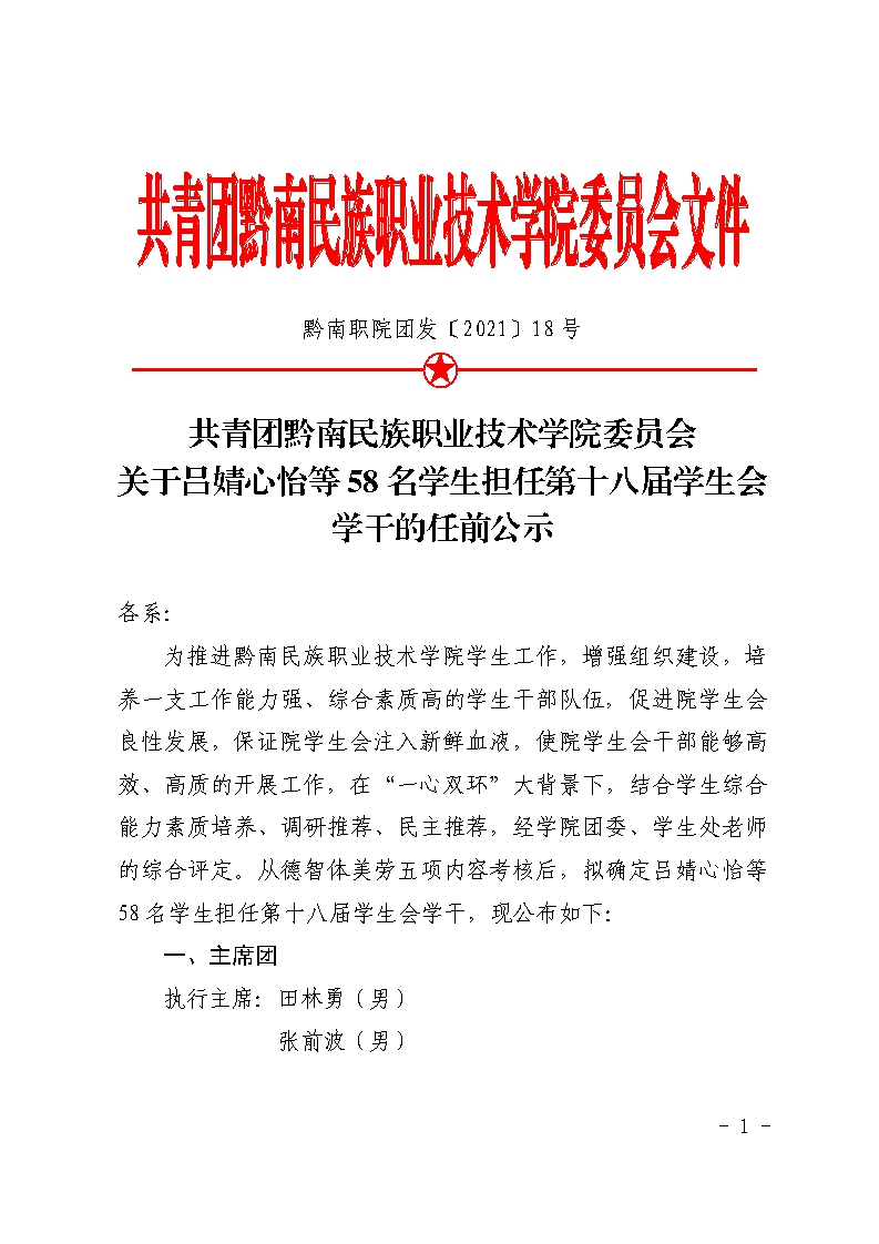 团发〔2021〕18号文件:关于吕婧心怡等58名学生担任第十八届学生会学干的任前公示(1)
