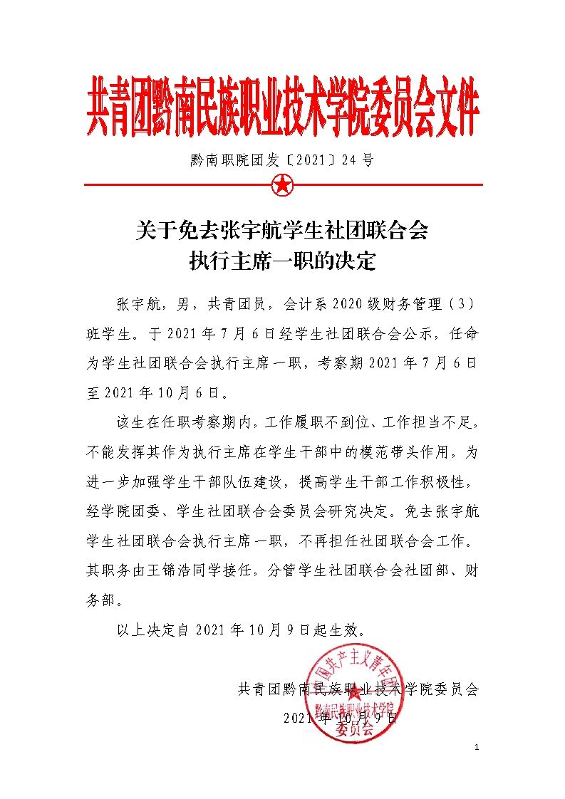 团发〔2021〕24号:关于免去张宇航学生社团联合会执行主席一职的决定