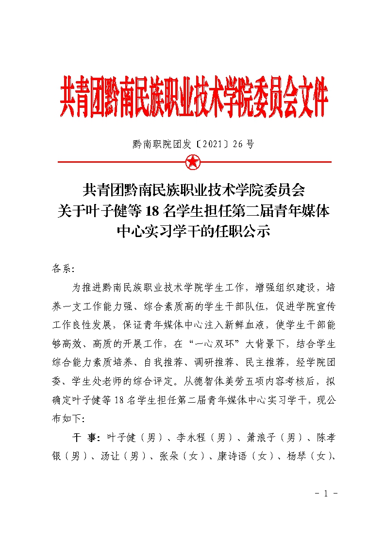 团发〔2021〕26号文件:关于叶子健等18名学生担任第二届青年媒体中心实习学干的任职公示