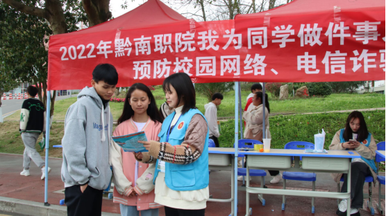 随着互联网、电信业的不断发展,近年来不法分子利用电话、短信、互联网等方式,频频把经济行骗的触角伸向校园,大学生受骗案例屡屡发生。为切实提高我院师生对电信网络诈骗的识别和应对能力,筑牢师生安全防范意识,杜绝校园诈骗事件发生。2022年3月24日,院学生会在中区食堂路口开展了2022年黔南职院我为同学做件事之“防诈骗·你我同行”预防校园网络、电信诈骗法治宣传活动。