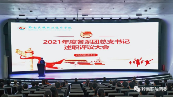 2022年4月1日,院团委在知行楼学术报告厅举行了2021年度各系团总支书记述职评议大会。院党委副书记韦永革,党委委员、副院长张金华,学生工作处处长潘奇出席本次会议,各系党总支书记和武装部部长肖明强担任评委,院系、中职部、直属武装部团支部100余名学生代表参加会议。大会由院团委分管负责人赵一瑾主持。