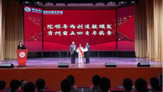 首先,院党委书记罗俊,院党委副书记、院长刘荣鹏为大数据与电子商务系2018级学生刘道敏颁发贵州省五四青年奖章。