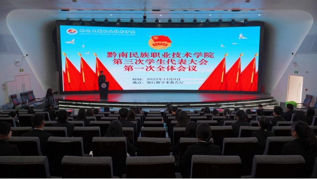 2022年12月9日,黔南民族职业技术学院第三次学生代表大会在知行楼学术报告厅隆重召开。黔南民族职业技术学院党委书记罗俊、院党委副书记、院长刘荣鹏,院党委委员、副院长张金华出席会议。学院学生处、教务处、组织部、思政部和各系党总支、系团总支工作领导、大会代表、列席人员共计200余人参加大会。